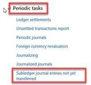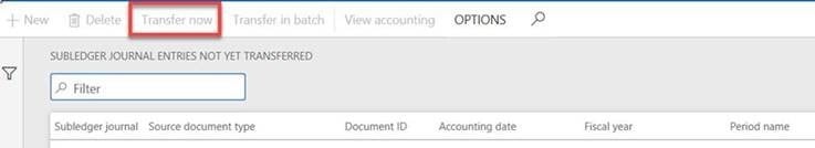From within the General Ledger > Periodic Task > Subledger journal entries not yet transferred screen, you can view all vouchers that have not yet transferred. If you want to manually transfer these vouchers, you can click on Transfer now to post them immediately.