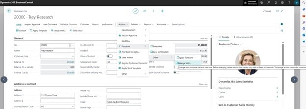 With Business Central, you can run a process to merge the duplicate cards. The system will identify conflicting information so you can reconcile multiple cards and make sure the new merged card has all accurate information. Once you finish reconciling, Business Central moves all the transaction activity for that customer or vendor into the merged card.