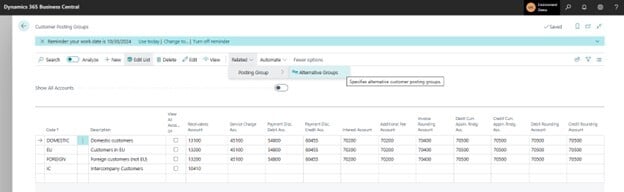 Allowing alternate Customer Posting Groups or Vendor Posting Groups helps a user control these accounts. You can allow users to select posting groups other than the default groups when they're working with sales documents, purchase documents, and journals.