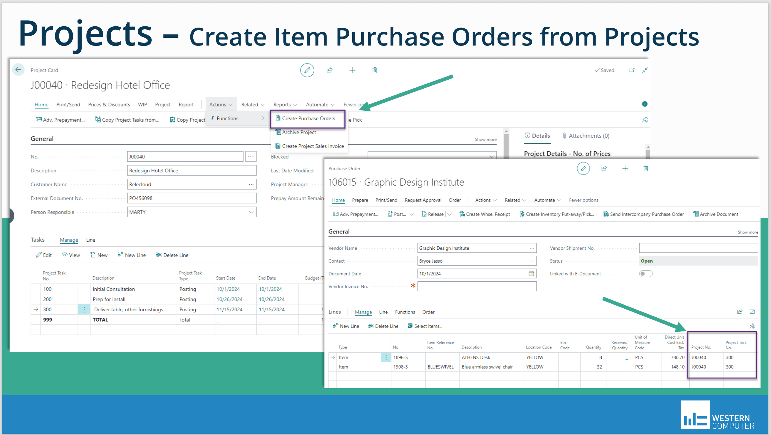 The big new win for many users, however, is the flexibility to create purchase orders right in Projects. Users have been wanting this for years, and Microsoft has listened to the user community. You can easily see which items you need to purchase for a project and then create the PO with the project number and task lines automatically pushed to the PO.