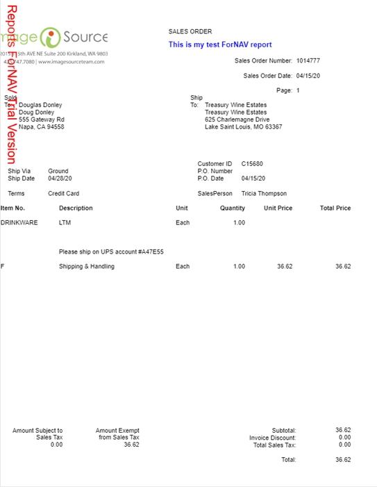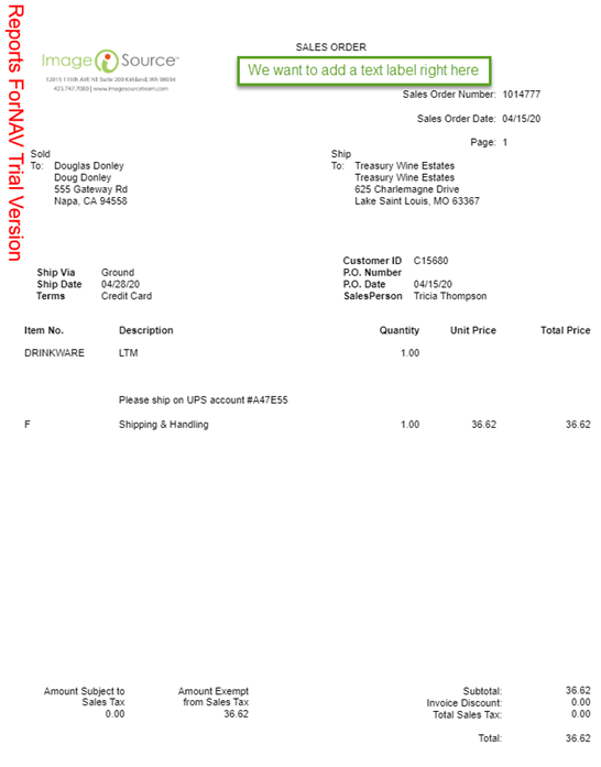 As you can see, your custom field has been added. You may also notice that the formatting changes you added in our last article (ForNAV Tips Part 5: How to Use Custom Report Layouts to Update Business Central Reports) are no longer present. And the report is once again skewing to the left and the logo is too big.