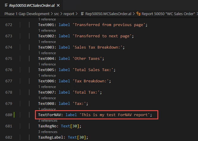 Now go to [reports global variables] and create a new label called [TextForNAV]. You can define it any way you want; in this case, mine says [This is my test ForNAV report].