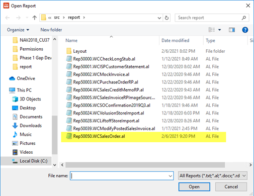 This allows you to designate which report you want to design. Next, navigate to your new [Sales Order] report. Be sure to use the [.al] file, not the [layout] file. Then open it up: