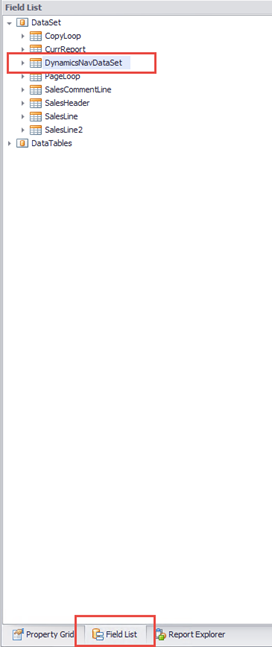 Next, expand [DynamicsNavDataSet] to reveal all available report columns. If you scroll toward the bottom of the list, you will see your new label. Everything is in alphabetical order, which makes it easy to track things down: