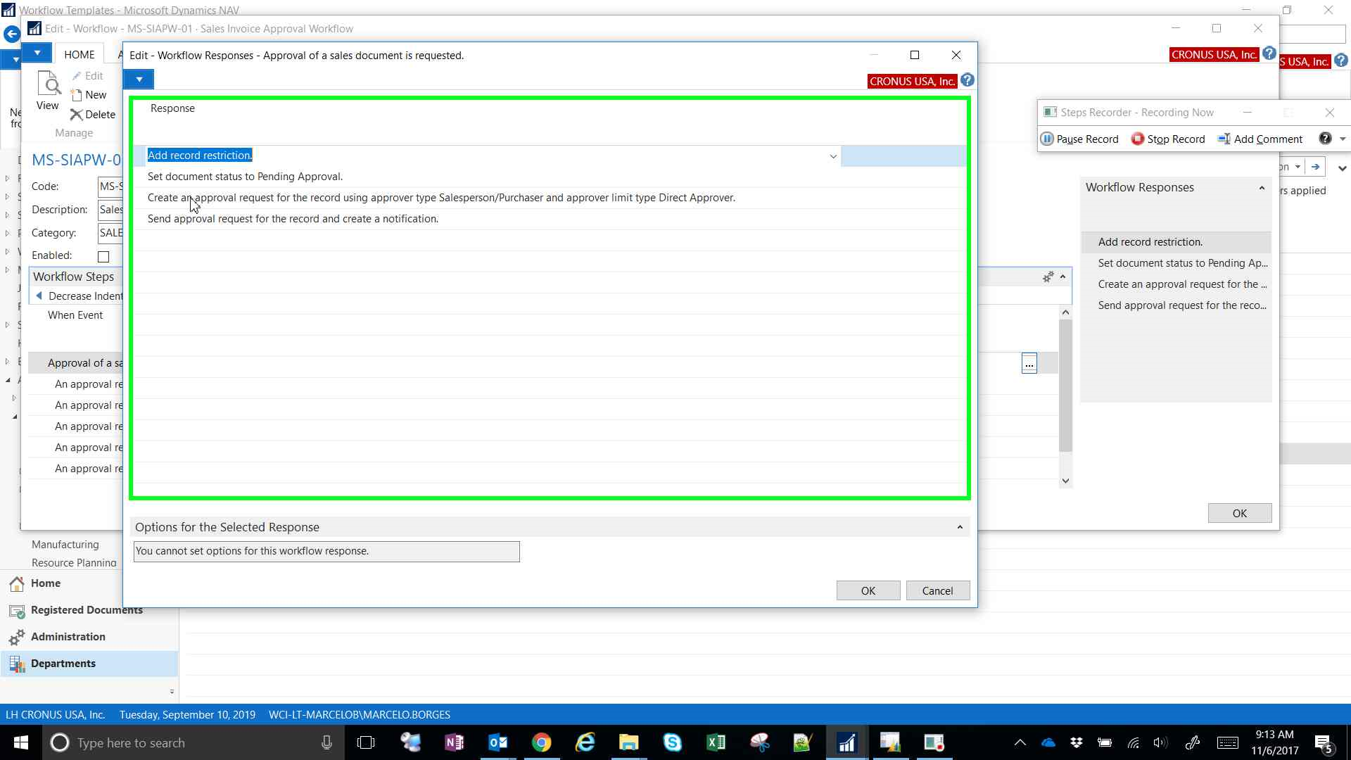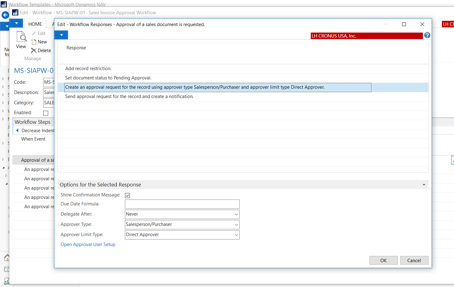 Left click Create an approval request for the record using approver type Salesperson/Purchaser and approver limit type Direct Approver, and the box Options for the Selected Response will show up.