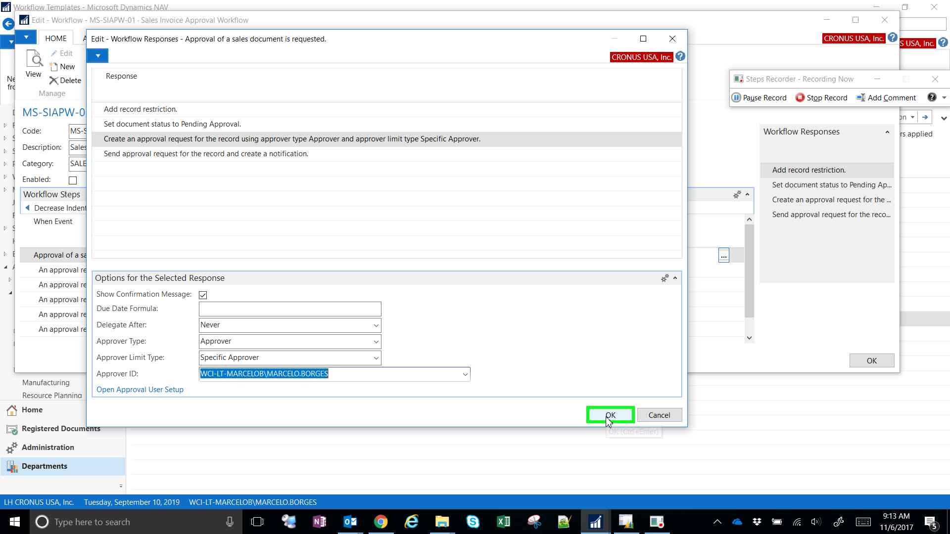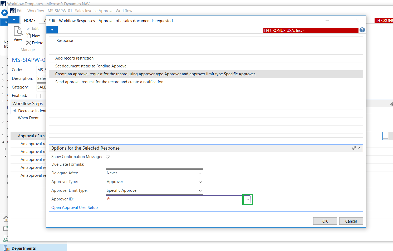 This will take you back to your approval request setup with the Specific Approver’s User ID inserted. Click OK to save your new workflow and close the window.