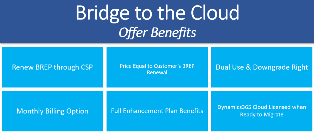 The limited-time offer called Bridge to the Cloud 2 is available to all Dynamics end users who own an on-premise license and have an active Enhancement Plan (EP).