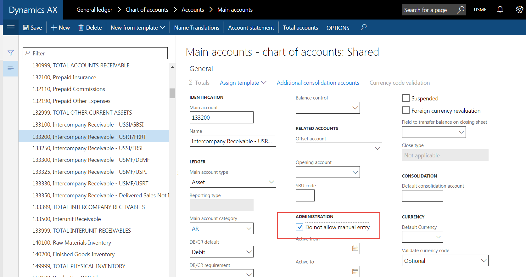 - To facilitate reconciliation of all the Due To/From accounts, our clients mark all these accounts as Do Not Allow Manual Entry. This will lock these accounts so that users cannot inadvertently post manual entries to them. You then have confidence that all the Due To/From accounts across all your companies will balance as they will contain only automatic entries. With the proper security, this box can be easily unchecked at month-end as needed to clear out the balances.