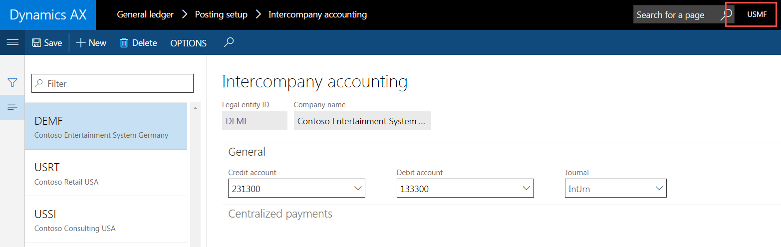 Each combination of origination and destination company must be set up, both in the origination company and in the destination company(s). The above example is set up in USMF legal entity and will allow vendor payments between USMF and DEMF, between USMF and USRT and between USMF and USSI.