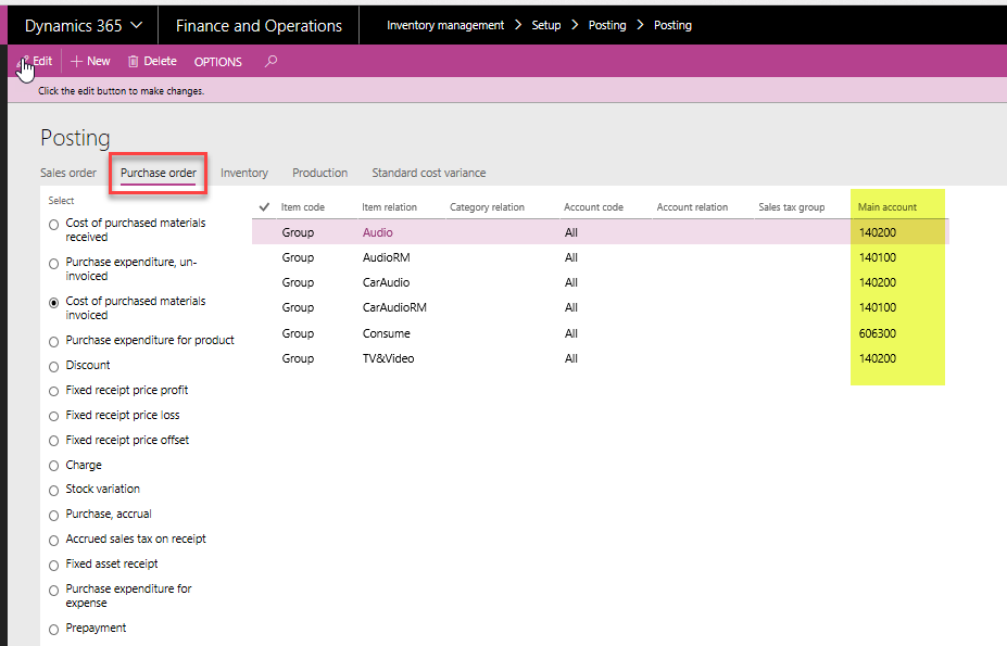 - For example, “Cost of purchased materials invoiced” is used to tell the system where to book the debit when a purchase order is being invoiced. Note in the highlighted yellow area that for different types of items, they have set up different general ledger accounts.