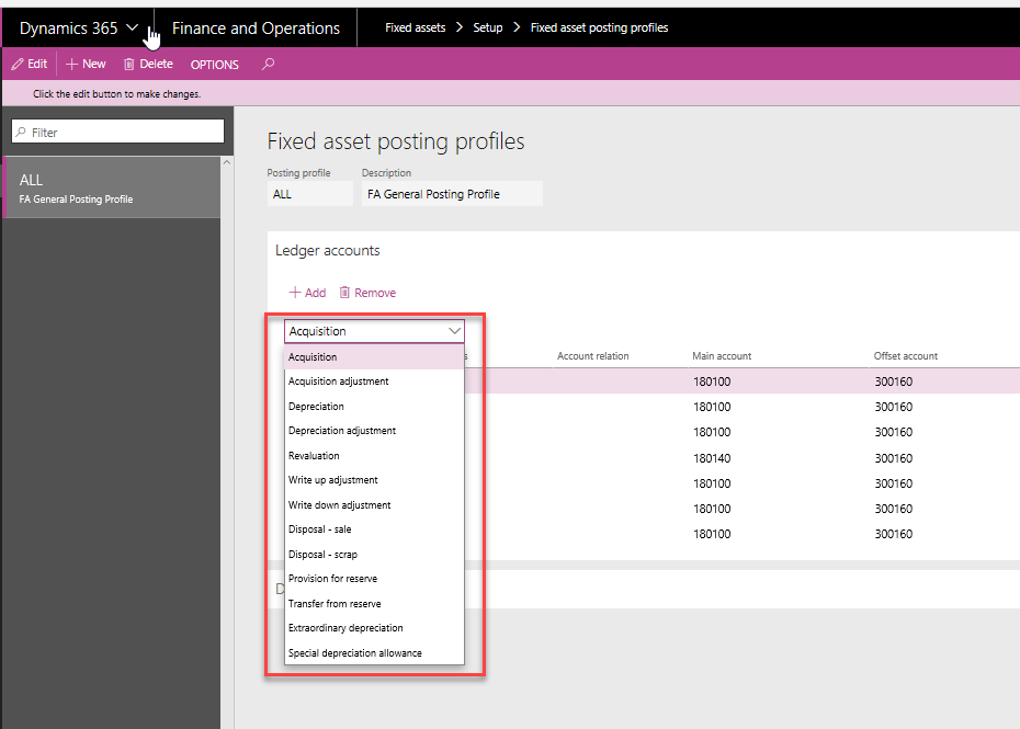 Below is an example of the fixed assets posting profile. Note the drop-down list of the common types that might be used when recording fixed assets transactions such as: