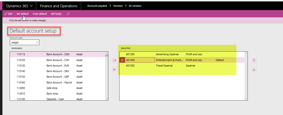 - An organization will often post to 2 or 3 accounts when posting vendor invoices that are not supported by a purchase order. Dynamics 365 allows the organization to attach these default accounts to the vendor record and even specify one account as the overall default to be used.