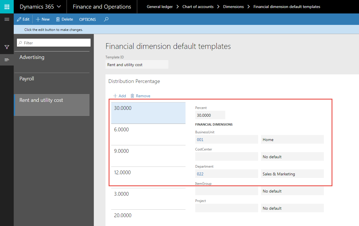 These templates are useful when a vendor invoice or purchase order gets charged to multiple financial dimensions in the same percentages for many transactions. Examples include utility bills charged to multiple departments based on square footage, or trade show expenses for more than one product line.