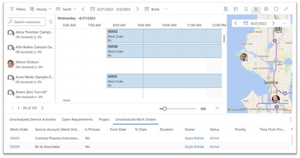 Picture: a view of the next generation schedule board displayed in hourly view, with the map displayed and unscheduled work order views.