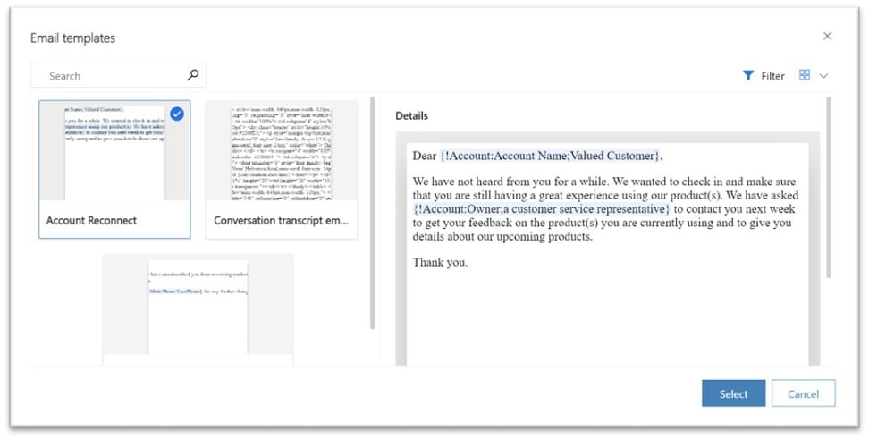 This admin enabled feature will provide the end user with the ability to change how email templates are displayed when searching in the Dynamics 365 Customer Insights platform. Previously, users only had a list view, but now the system offers a grid view and a tile view. The actual search capabilities have extended the ability to search for content based on a templates title, description, OR content. The original capability was limited to searching by template title/subject, so now users can type in content that might appear in the body of a template and find results. Finally, a filter option has been provided, so end users can input their own custom filters if searching off key terms isn’t narrowing the list enough.