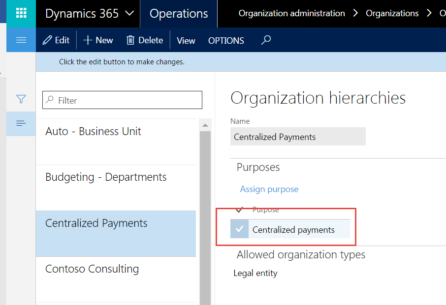 - Setup Organization Hierarchy for Centralized Payments. A new (and under-utilized) feature of Dynamics AX 2012 is Organizational Hierarchies. For Centralized Payments, we need to set up an Organizational Hierarchy with Purpose = Centralized Payments. All of the legal entities which will participate in the multi-company cash receipts and disbursements must be included in this hierarchy.