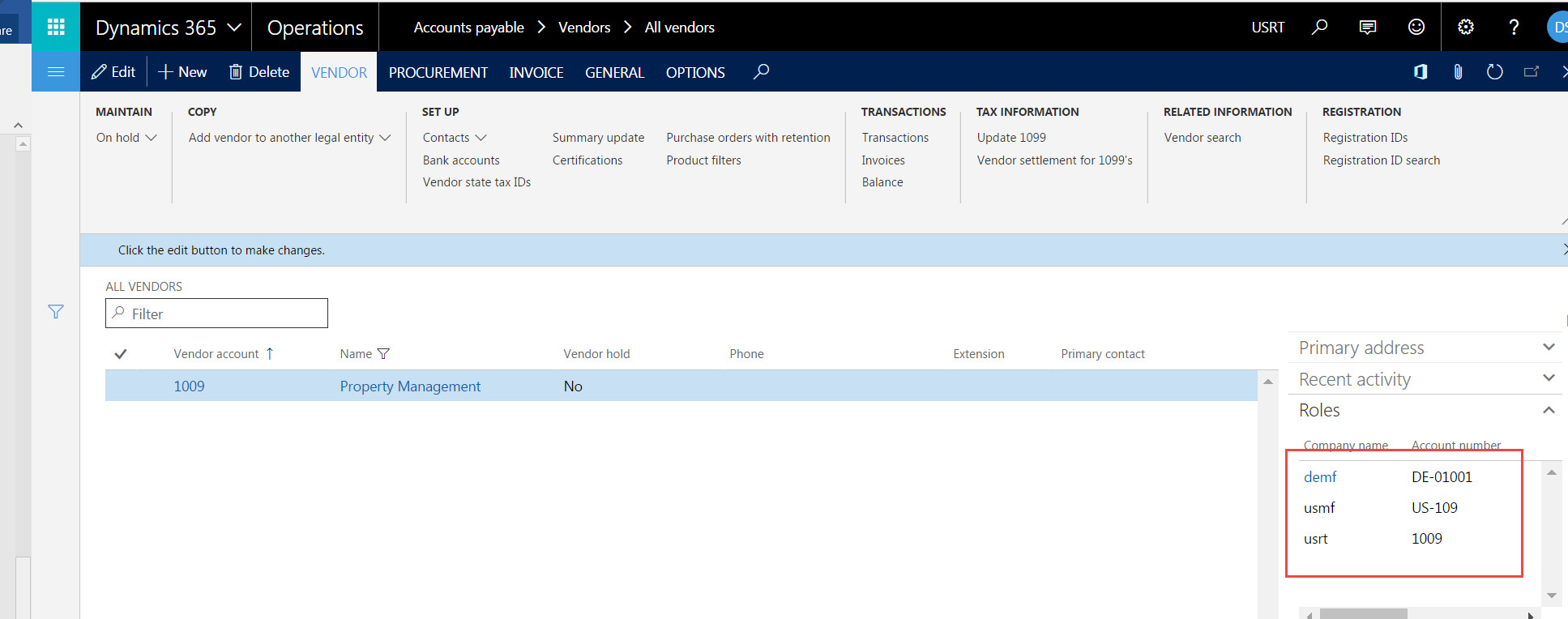 To confirm that the vendor accounts are linked correctly in the Global Address Book, go to the vendor account in any of the companies and note that all the vendor accounts and legal entities are displayed in Roles.