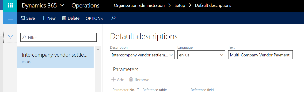 - Default Descriptions (optional). To make the resulting multi-company cash receipts and disbursements intercompany transactions easier to trace, we often use default descriptions. Go to Organization Administration > Setup > Default Descriptions.